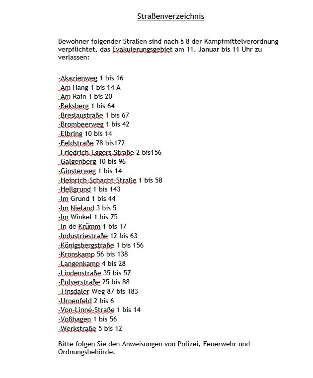 Am 11.01.2026 wird im Wedeler Industriegebiet eine 250 Kilogramm schwere Fliegerbombe entschärft. Ca. 6000 Haushalte innerhalb des Gefahrenbereichs müssen ihre Wohnungen bis 11:00 Uhr verlassen haben. Ein Gefahrenbereich im Radius von ca. 1000 Metern um die Fundstelle wurde festgelegt. Die Polizei wird Straßensperrungen einrichten und kontrollieren.